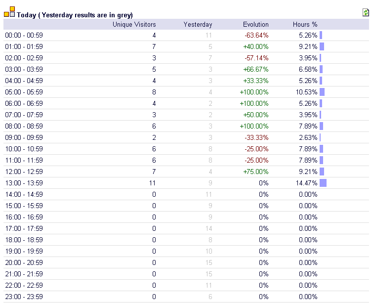 Per Hour: This value indicates the average number of unique visitors per hour. Today Estimate: This value indicates the number of unique visitors who would come on your site today. It is an estimate calculated by the program according to the unique visitors came since the beginning of the day. Today: Numbers of the unique visitors on your site since the beginning of the day Yesterday: Number of the unique visitors on your site for yesterday; This week: Number of the unique visitors on your site for this week. This Month: Number of the unique visitors on your site since the beginning of the month